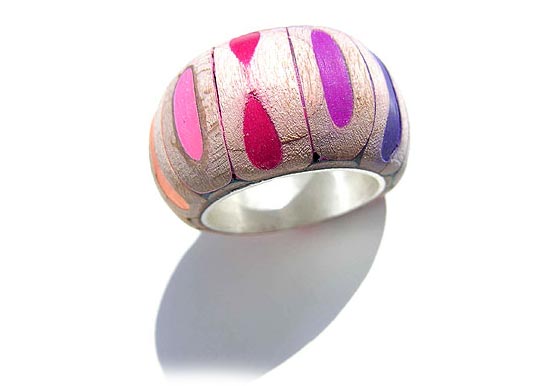 Often, attempts at making eco-jewelry can be a tad too juvenile. But Italian artist Maria Cristina Bellucci makes playful rings out of old colored pencils that still manage to be chic and sleek. By attaching fragment pieces of colored pencils, the rings reveal both the color and natural wood base. A striking use of upcycling!