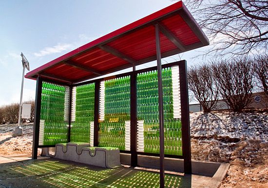 There are some interesting designs when it comes to bus stops around the world, and the Bottlestop Bus Shelter Project is no different. The work of artist Aaron Scales, it’s built from recycled soda bottles (all sources locally), and is lit up at night with LEDs.