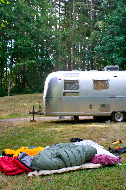 After a balmy, summer evening spent outside, it’s hard to return indoors. Fortunately the big yellow house if fully stocked with sleeping bags, perfect for a night under the stars with two best friends. No point in sleeping in the Airstream on an evening like this.