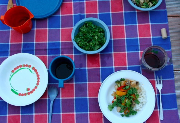 • It’s all old camping gear… and the tablecloth my parents bought in Europe in the 70s!