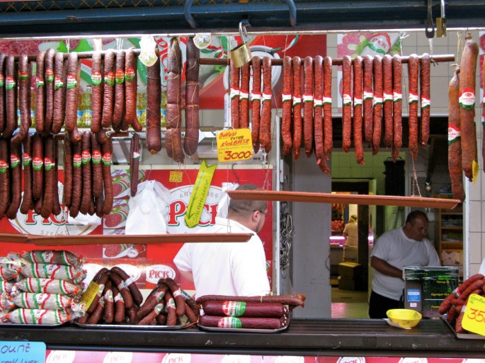 We were staring at the wide array of meats behind the glass, busily snapping photos of everything from beef lungs to goose liver, knowing perfectly well that meat photos aren’t necessarily the most appetizing of food porn. With several floors of fresh produce and more meat than you can handle, the Great Market Hall, the largest indoor market in Budapest, has plenty of it, and Carolyn Banfalvi, owner of Taste Hungary, a Budapest-based company that offers food, wine and market tours, was taking us on a quick run through to make sure we knew all about fried fat and the importance of duck meat.