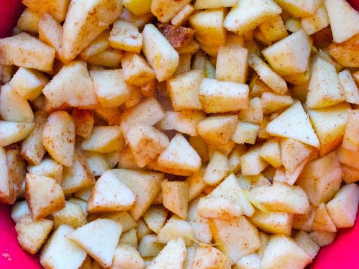 Peel and quarter all of the apples and cut into small, bite-size pieces. Mix in rest of ingredients until apples are well coated.