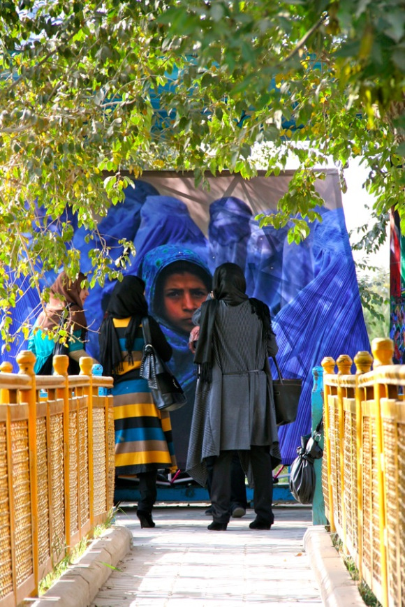A group of young women stood in front of an image of a girl amidst burqas, the deep blues contrasting with their more modern headscarves. They snapped a photo of themselves in front of it with a cellphone camera. Two minutes later a woman walked past, her burqa pulled back over her head exposing her eyes. I was again reminded how we all have expectations and assumptions.