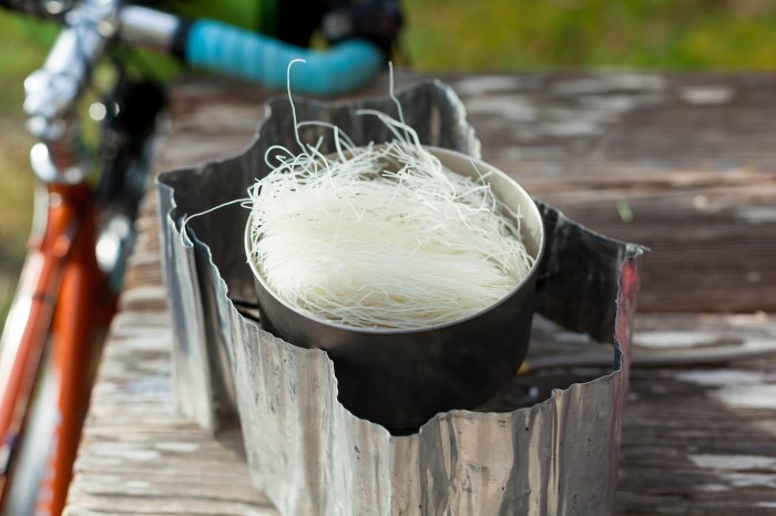 Vermicelli noodles are a fast base for this dish, and most of the prep work you can do at home, which makes putting this together after a long day in the saddle fairly simple. Bringing a few fresh ingredients like cilantro and green onion isn’t necessary, but it really pulls the meal together, and they’re easy to pack in a plastic bag. Sliced tofu will add a little extra protein if you want it.