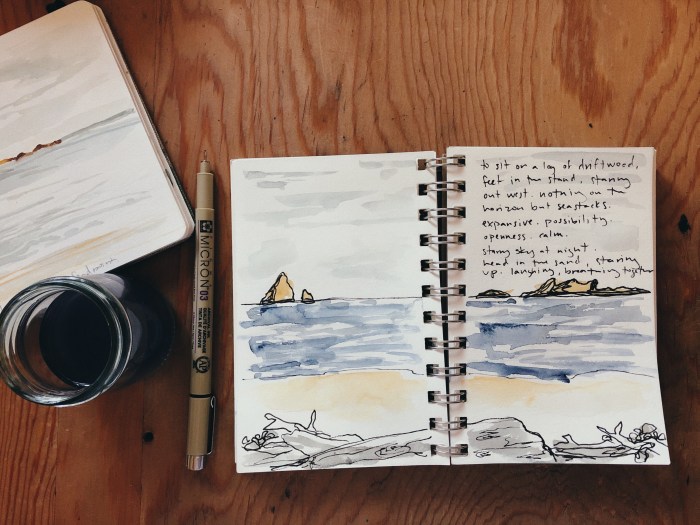 Once you have done a little writing about where you are, what you are seeing, and what you are feeling, add some drawings. I think it’s helpful to focus on a few objects that help to capture the feeling of a place. So let’s say you put yourself on a beautiful beach somewhere tropical; focus less on capturing the entirety of the beach and everything that’s on it, and focus instead on a handful of individual elements that feel true to the scene. The blue of the water, a towel, a shell on the sand.