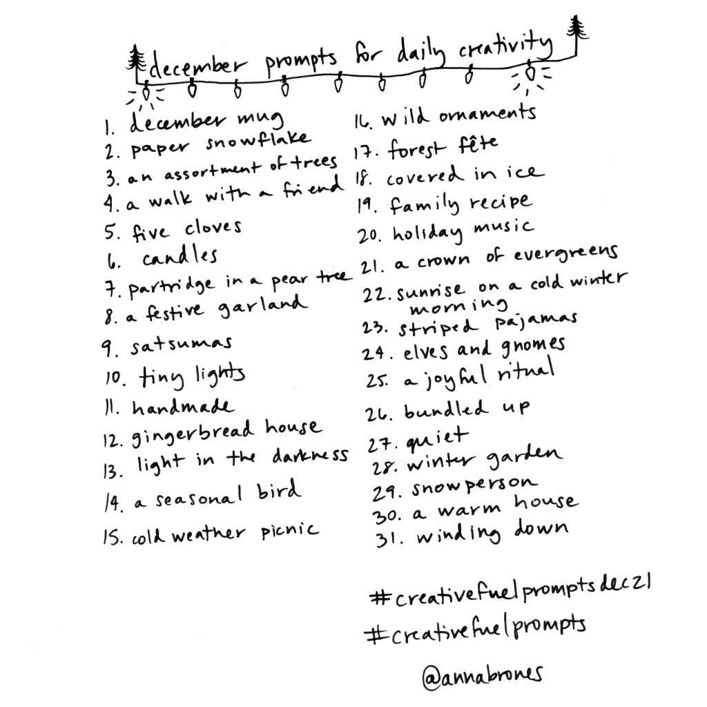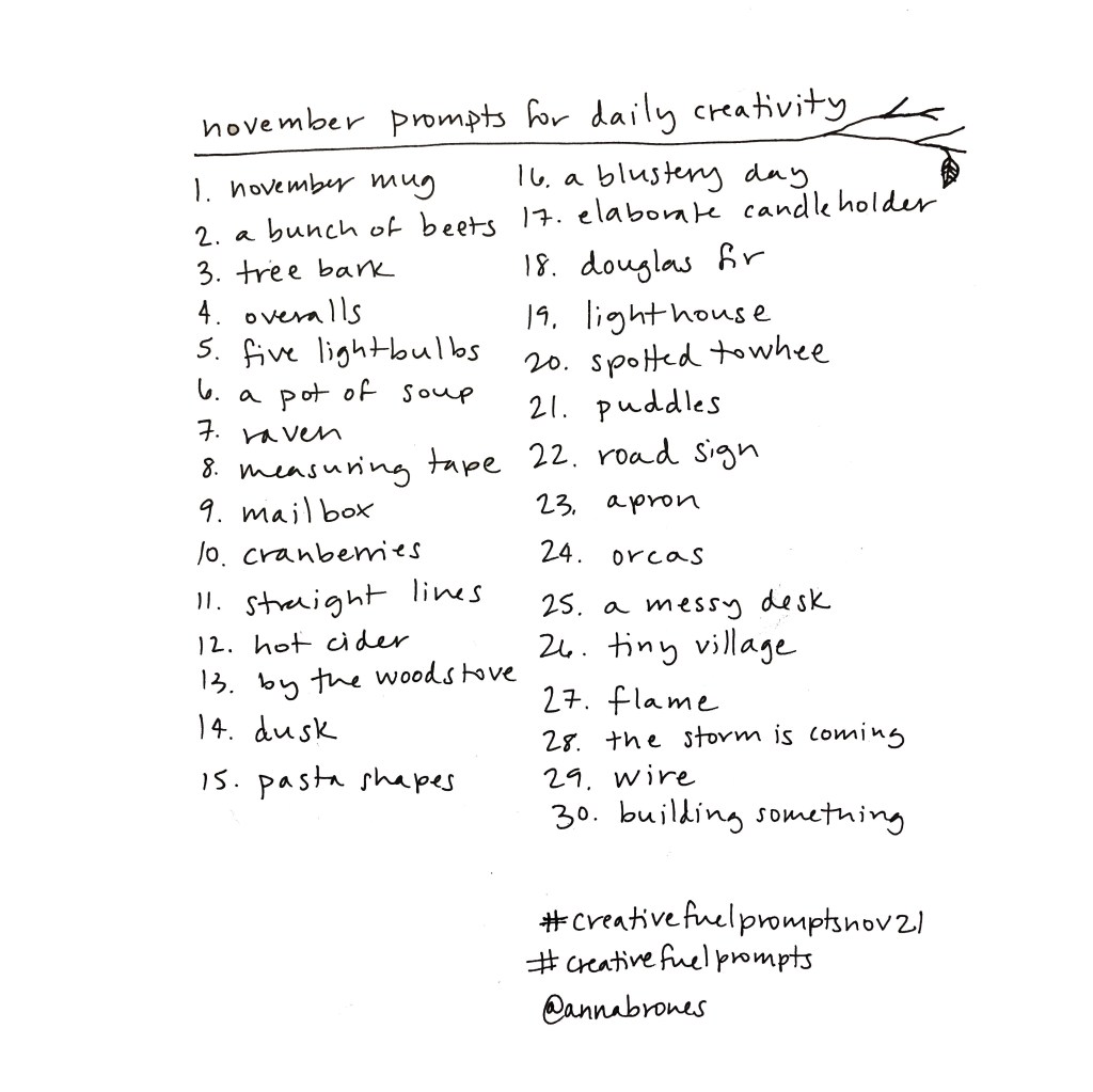This also marks an entire year of me making monthly lists of daily #creativefuelprompts. I haven’t done them all (except for the monthly mugs!), but making them has been a reminder to constantly invest in creativity, no matter what the investment is. Thank you to all of you who have done some of them, many of them, or all of them if you’re my friend Margret (seriously she did an entire year’s worth).