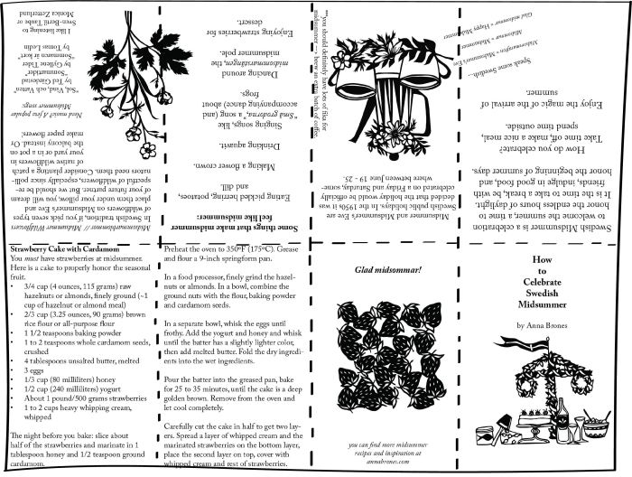 This coming weekend marks the celebration of Swedish midsommar. In honor, I made a zine that you can download, print, and fold at home. It even includes a recipe for a strawberry and cardamom cake. If you need help on how to cut and fold this zine, you can find instructions for that here (as well as a zine about another favorite Swedish custom of mine: fika).