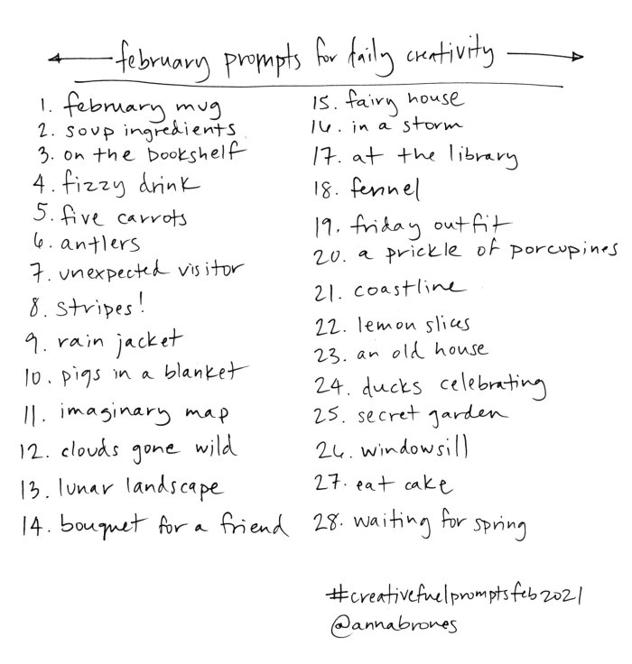If you post your work, use the hashtag #creativefuelpromptsfeb2021 so we can see them all in one place. You can see some of the results from January here.