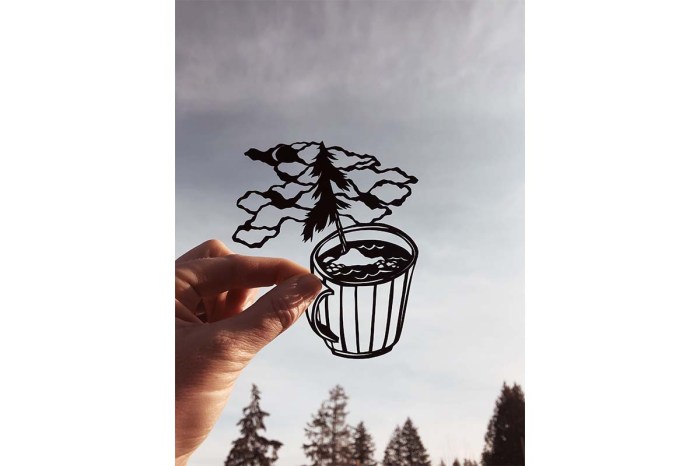 I wanted the custom papercut that I made for this piece to capture the essence of time spent outside. For me, that’s usually in my Pacific Northwest stomping grounds, and fortunately the landscapes that inspire me—islands, sea, evergreens—are very at home in Alaska, where Powers Provisions is based.