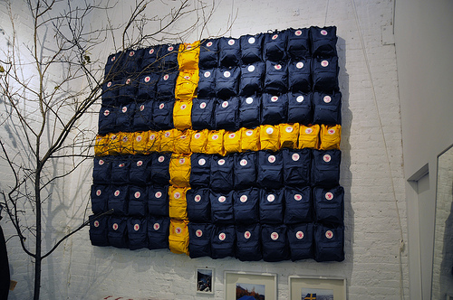 There are few times when I wish that lived in a city other than Portland… but this month has given me a few reasons to want to live elsewhere. First there was the Nau NYC pop-up shop. Who doesn’t want to go visit that? And now it’s the Fjällräven NYC store. The Swedish brand is probably best known for its classic, and slightly vintage-looking, backpack (yes, that is the Swedish flag made out of a bunch of them pictured above).