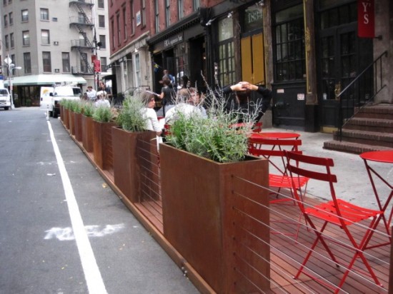 Taking the place of several parking spaces, the outdoor seating doesn’t conflict with the sidewalk traffic, and it’s a project that the DOT is more than happy to support. “Every time we put down just an orange barrel, people just materialize out of nowhere,” said Transportation Commissioner Janette Sadik-Khan to Streetsblog. “If you build it, they will sit.”