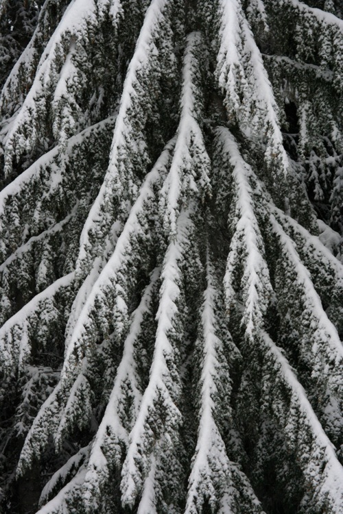 While the rest of the world is experiencing extremely low temperatures and plenty of snow and wintry weather, I’m stuck in dreary drizzle. Which means I’m longing for genuine winter. I love the lines of this tree; the way the white snow lays on the dark green and creates an interesting perspective of shade. A simple photo that says a lot.